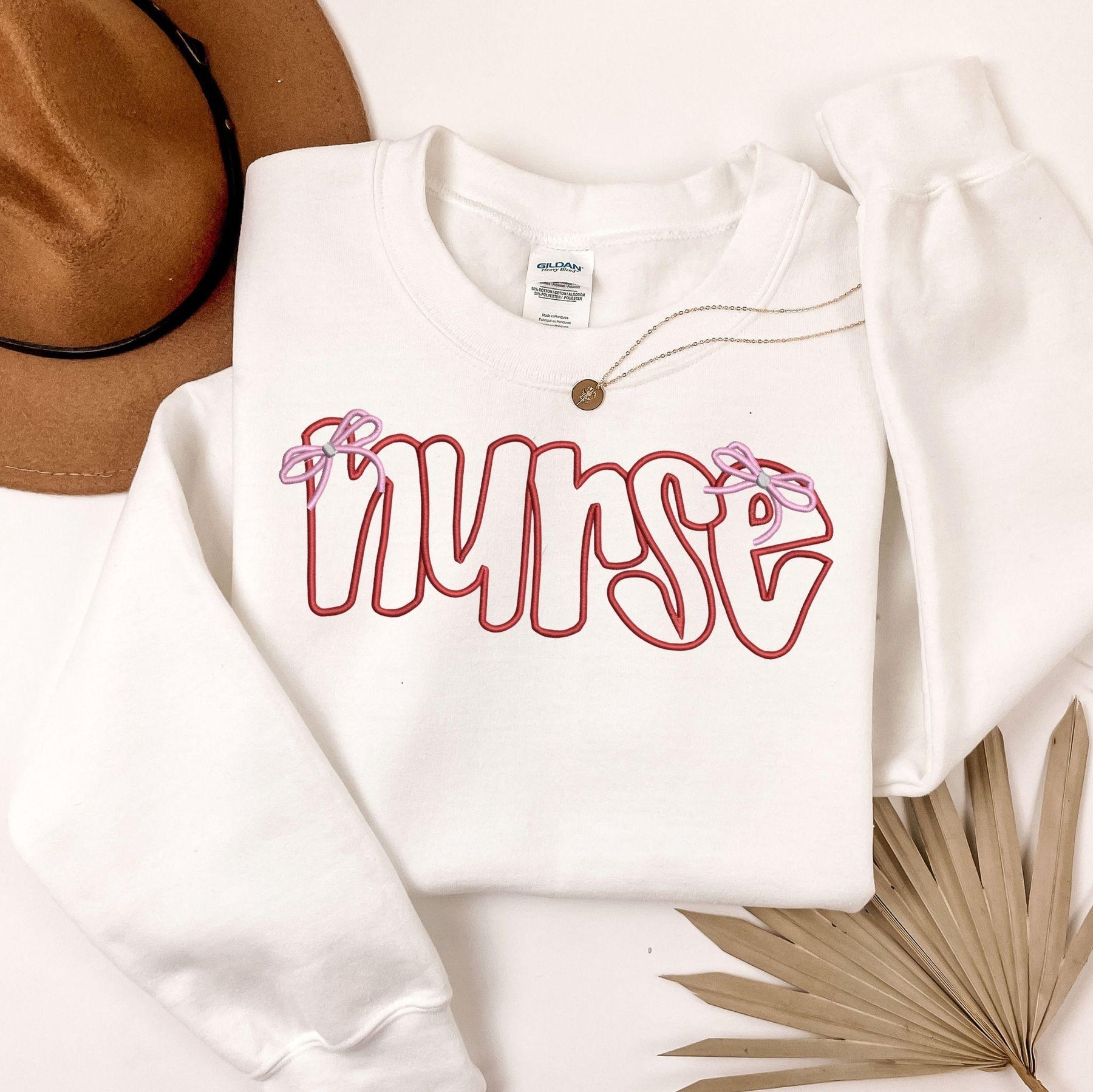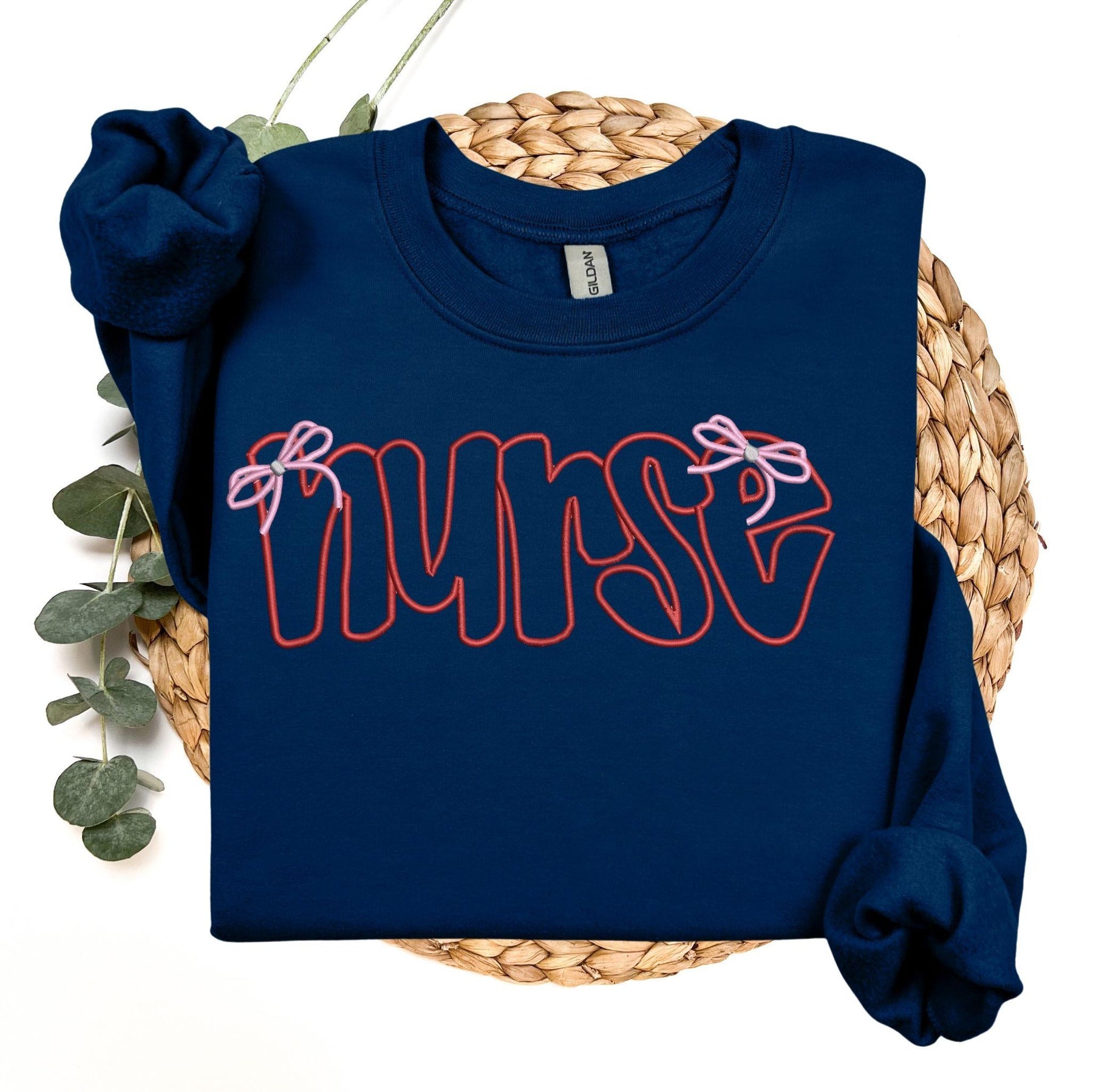 This Gildan crewneck features the Nurse Bow Embroidered  on the front, a cozy essential made for nurses and everyday wear.